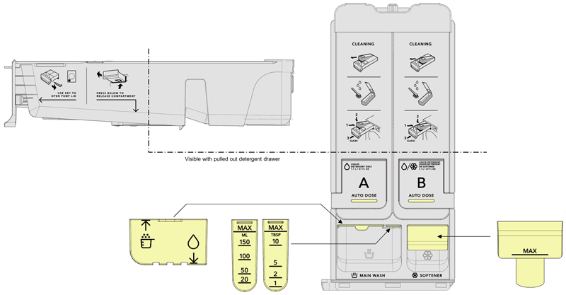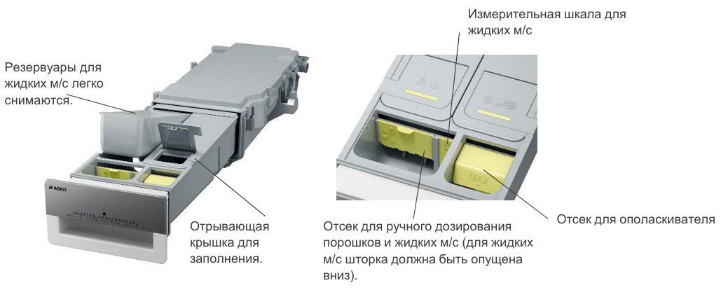 - Исключительная система автоматического дозирования ASKO: Забудьте о неудобствах. Усовершенствованный узел регламентированного упорядочения интегрирует два вместительных резервуара по 1,1 литра каждый. Они органично устроены в выдвижном диспенсере, созданном для ваших ценных моющих средств.